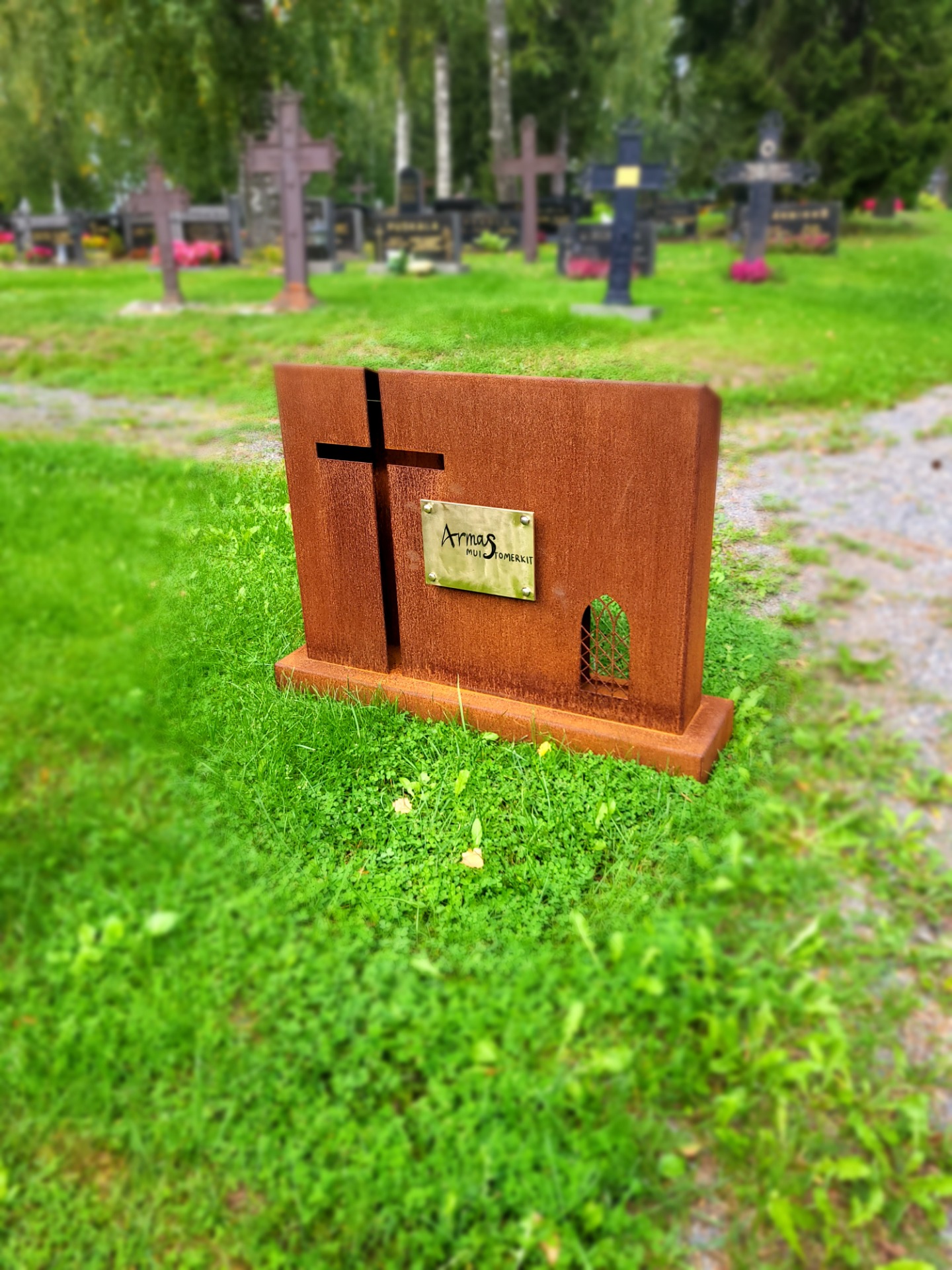 Yksinkertainen malli, risti vasemmalla. Tiedot kaiverrettuna messinkilaatalle.
